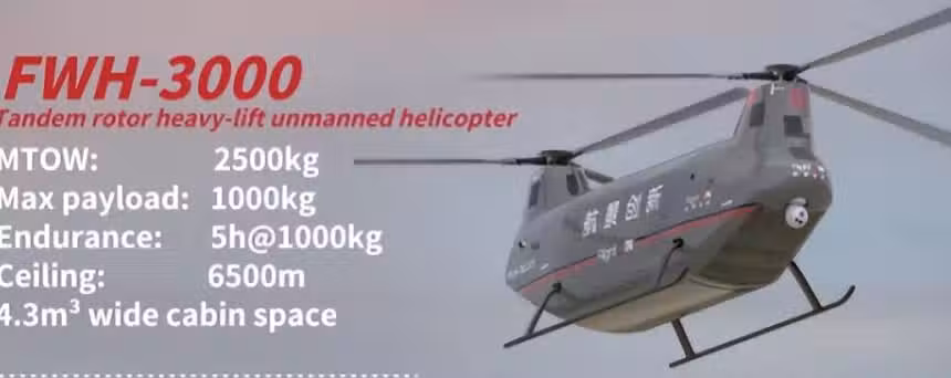 FWH3000的艙體達到了4.2m3,空間大,可同時搭載多種搜救設備和醫療設備,並在緊急情況下同時運送6名傷病員。同時,它還具備了當前國內外普通無人直升機不具備的外部弔掛能力,結合內部大空間,可實現大件物資的快速轉運。並且還能適應高原、沙漠、山地、海島礁等各種複雜環境。