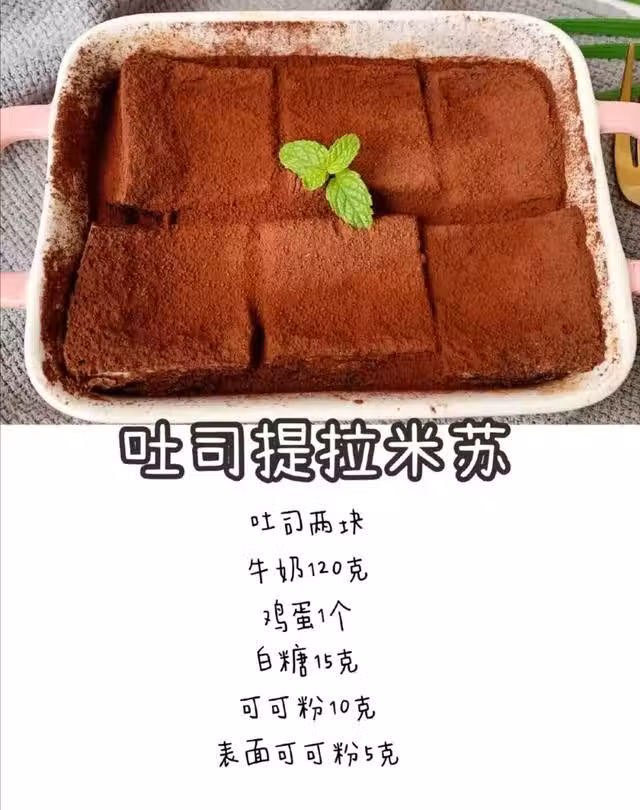 吐司兩塊牛奶120克雞蛋1個白糖15克可可粉10克表面可可粉5克做法: