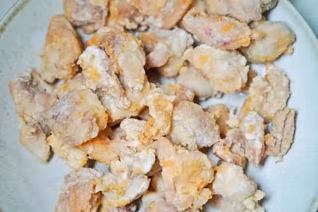 把雞肉炸到表面金黃,然後撈出準備復炸,撈出後等到油溫升高把雞肉再次下入到油中,復炸會讓雞塊變得更加酥脆好吃。