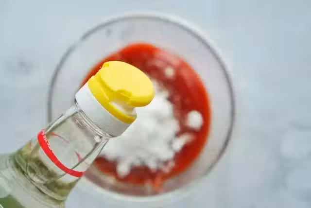 這一步我們來調一下醬汁,準備一個小碗,碗里放入番茄醬白醋和白糖,它們的比例是3:1:2,把它們混合均勻。