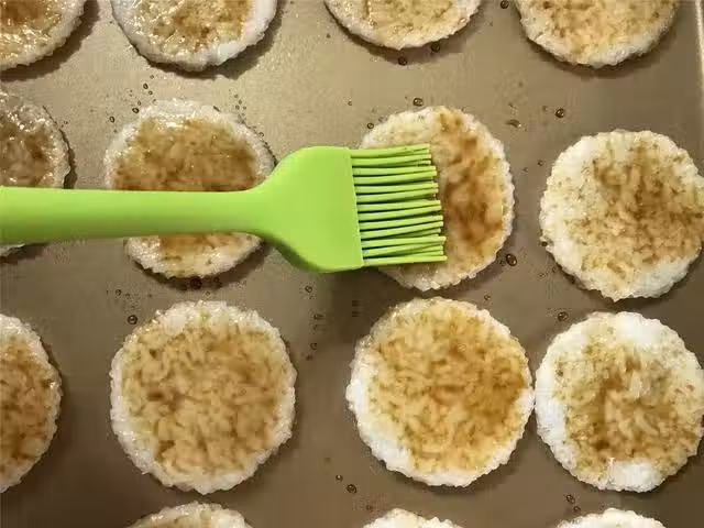 把烘烤好的米餅從微波爐中取出,然後把我們調好的汁均勻地刷在米餅上,米餅上要均勻的附著上一層料汁,米餅的正反面都要刷。
