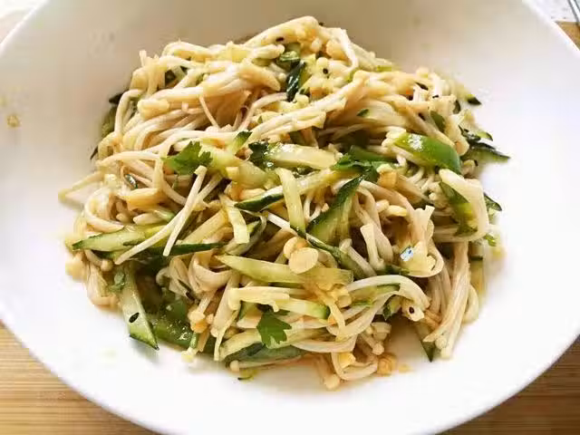 用料:金針菇 300克黃瓜 1根胡蘿蔔 1根鹽 1克生抽 3勺醋 1勺白糖 1勺干辣椒 3個蒜末 適量