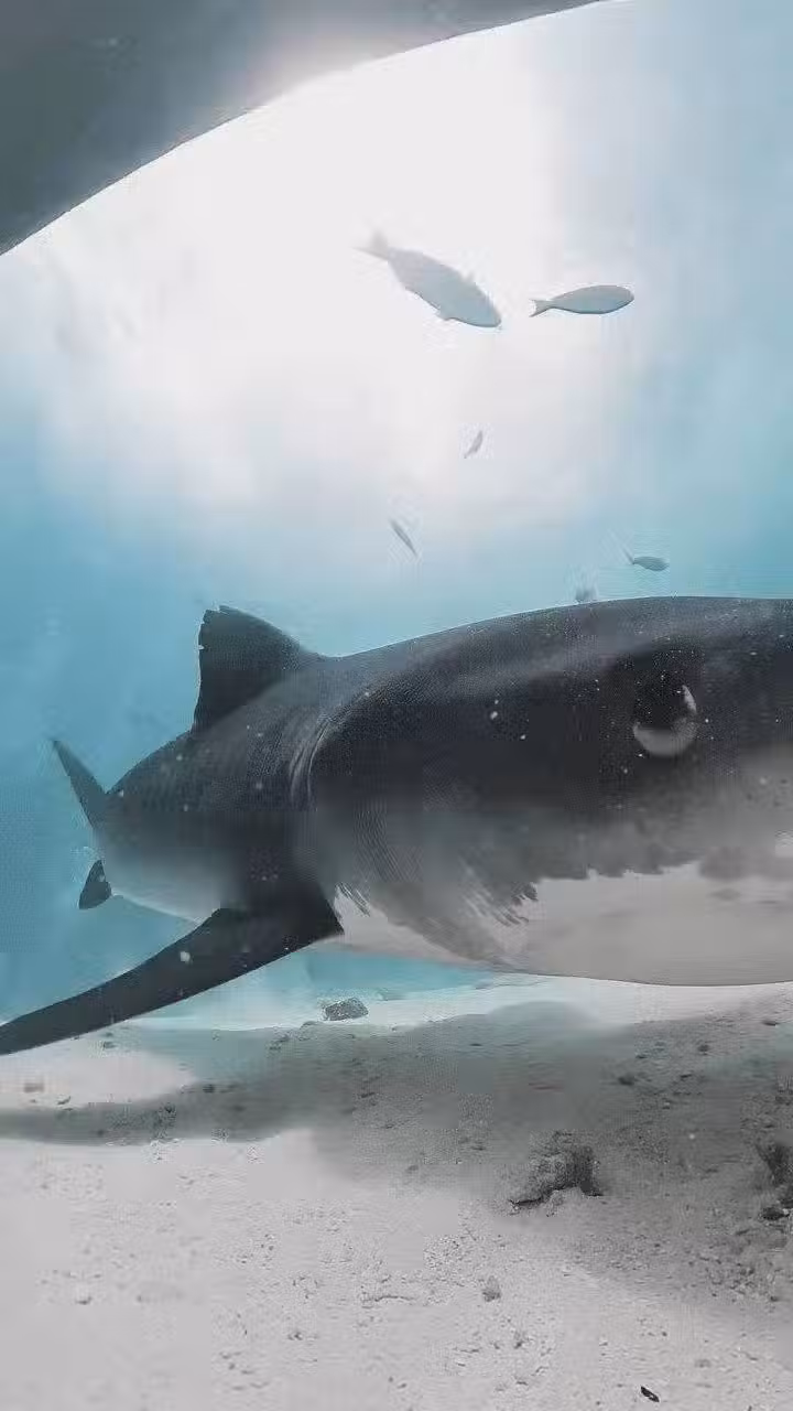 和攝影機對到眼後,下秒這只虎鯊就靠過來,接著直接張開了它的大嘴...
