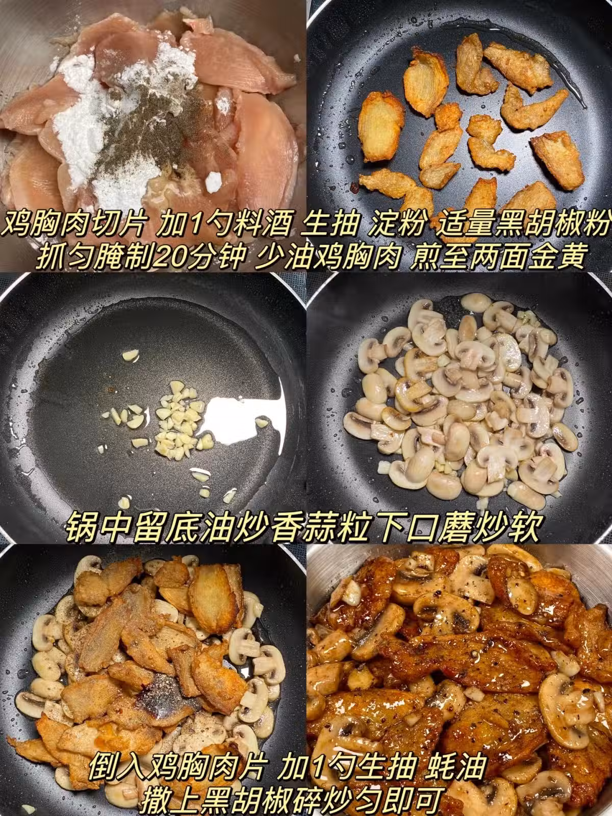 1⃣️口蘑洗凈切片備用,雞胸肉切片,加入一勺生抽、一勺料酒、少許鹽、黑胡椒碎、一勺澱粉,拌勻腌制一會