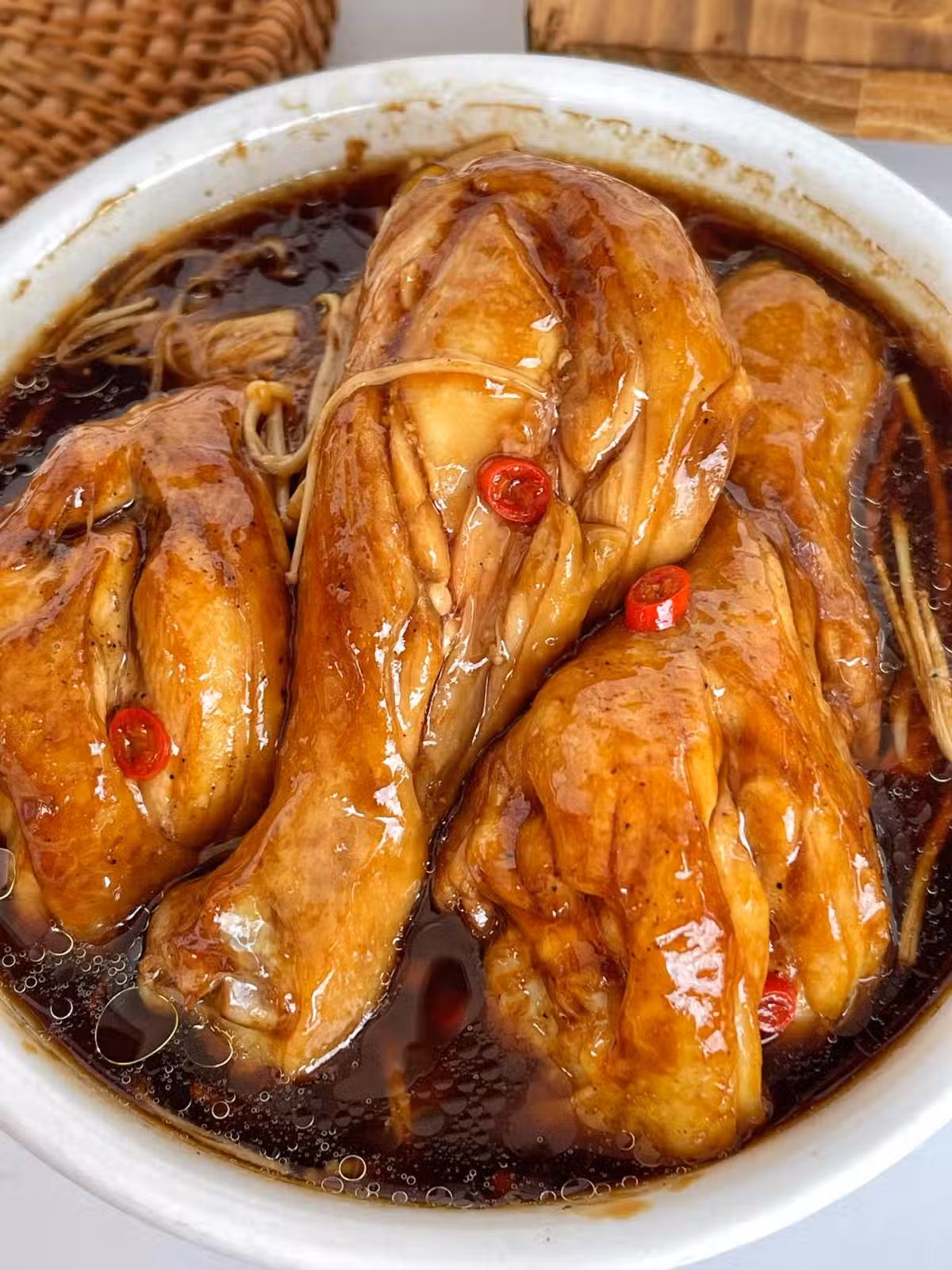 雞腿3個,金針菇250克,小米辣1個,生薑幾片;