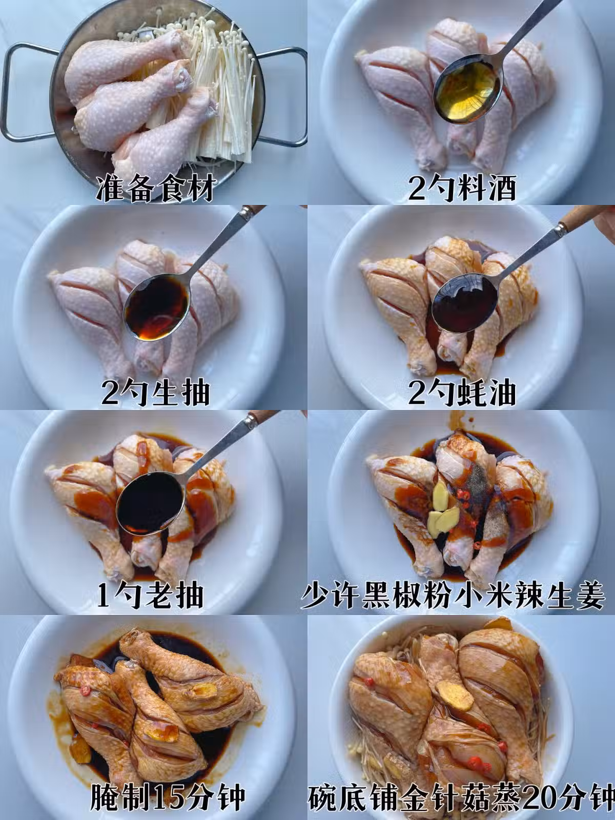 雞腿劃三刀,加入上述調料腌制十五分鐘,碗底鋪金針菇,再放雞腿和腌雞腿的料汁,上蒸鍋蒸20-30分鐘即可