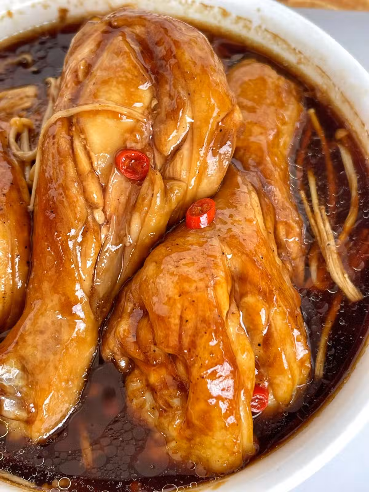 雞腿3個,金針菇250克,小米辣1個,生薑幾片;