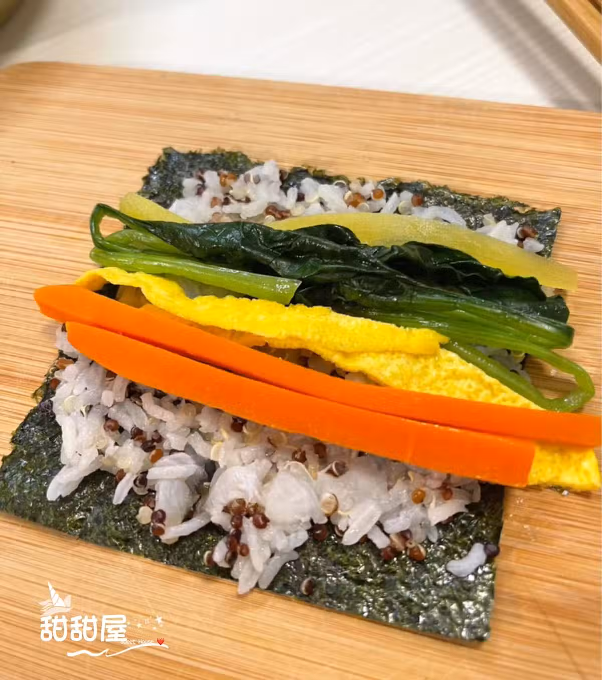 3⃣️均勻鋪平海苔!👉鋪上藜麥飯(用勺子壓一壓)👉放上配料卷緊🌯🌯(用米飯銜接邊緣滾一滾更緊實)