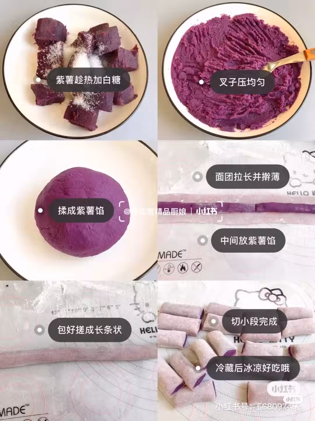 5.】糯米麵團分成小份,每份都拉成長條並擀薄,紫薯餡搓長條放在中間包好,再揉成光滑長條,切段即可