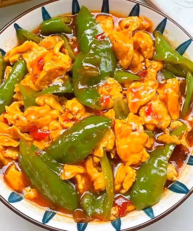 步驟三:起鍋燒油,將雞蛋炒熟以後盛出。鍋中留底油,放入青椒片炒至斷生,倒入雞蛋,翻炒均勻,最後再將調好的料汁倒入鍋中,大火收汁即可盛出。