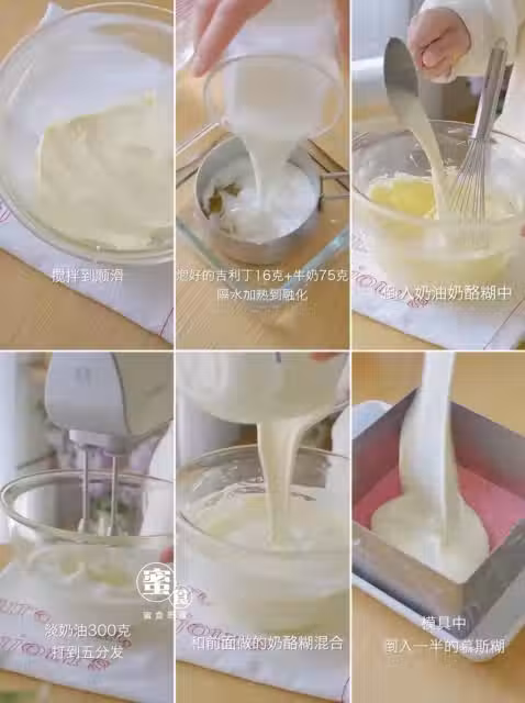 淡奶油打八到五分發,和前面做好的奶酪糊混合。