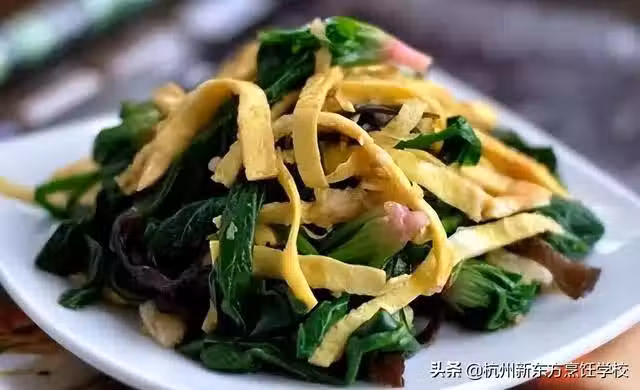 3、待雞蛋餅稍微晾涼後切成絲,與菠菜一同裝盤