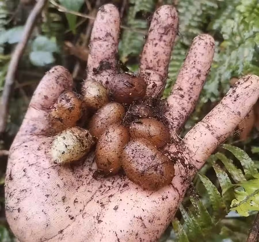 這種果子在我們當地還有一個說法,把它叫做 鳳凰蛋,這種確實比較難得,它是農村這種名叫腎蕨的植物的地下塊根,長得像雞蛋,又和土豆有點像,它還有一個名稱叫做石黃皮,黃皮果,大家應該都有吃過吧,一種夏季常吃的熱帶水果,一串串的。
