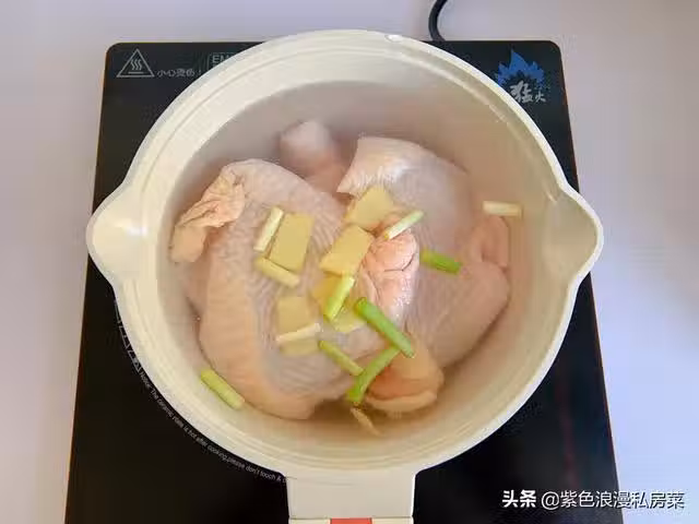 3.鍋中放清水,雞腿肉冷水下鍋,放幾片生薑,蔥白,放一勺料酒,大火燒開後轉小火煮15分鐘。