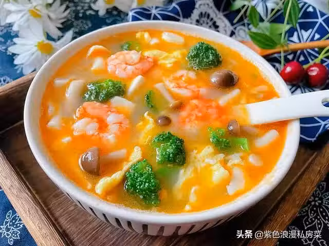 最近常給家人做這碗湯:鮮蝦菌菇豆腐湯,裡面加了雞蛋,蝦仁,嫩豆腐,白玉菇和蟹味菇,還放了一些西藍花做點綴,孩子就喜歡色彩繽紛,顏色鮮艷的食物,實際上它的味道也很鮮美。每次做這道湯,孩子都要喝一大碗。