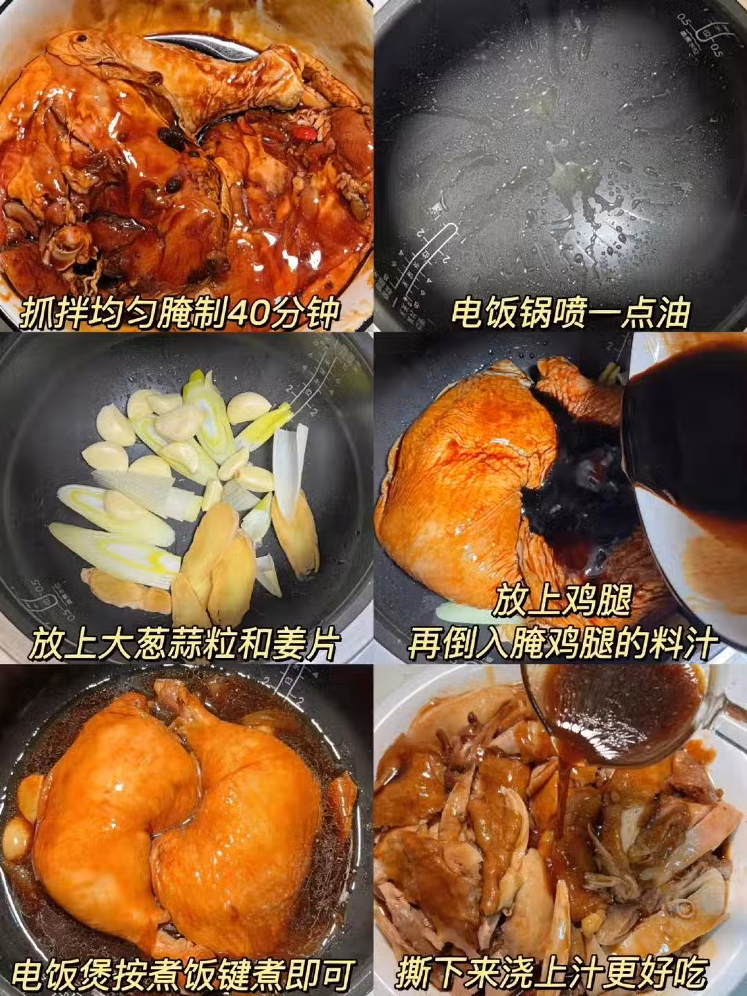 2️⃣電飯鍋噴一點油,放入大蔥蒜粒和薑片,放入雞腿倒入腌雞腿的料汁(料汁就是上面腌雞腿的方法),電飯鍋按煮飯鍵即可。