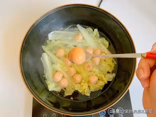 5.用左手虎口處擠出蝦滑,或者用勺子舀出蝦滑放入鍋中。