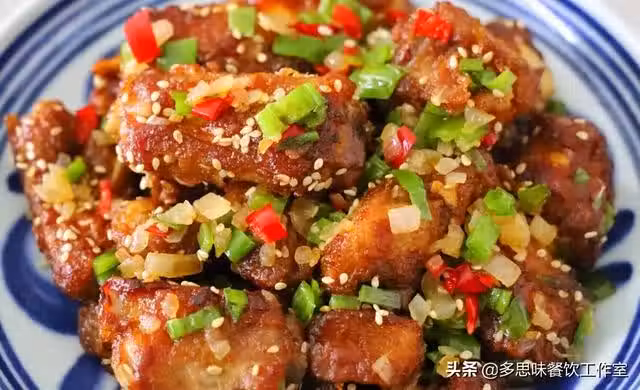 6、把炸好的排骨放入鍋中,一起翻炒均➕1勺白芝麻和➕勺椒鹽翻拌均勻即可。