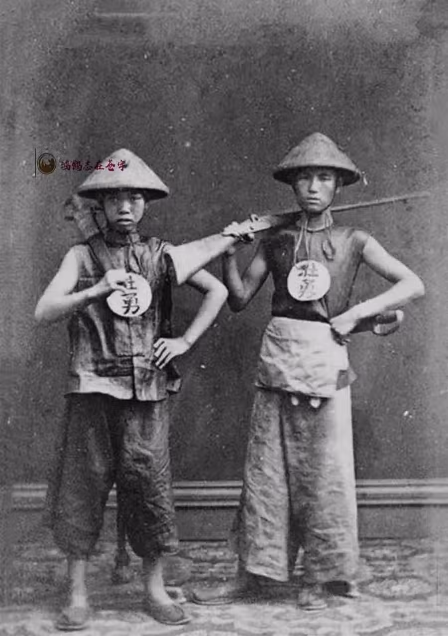 清末的士兵,胸口「壯勇」二字真夠諷刺的。兩人瘦如柴骨,談何保家衛國?