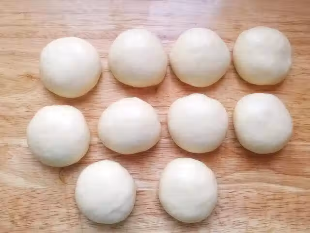 7、等鬆弛好後,揉面板上撒少許麵粉防粘,然後我們取一個麵糰拍扁,用擀麵杖擀成長舌狀