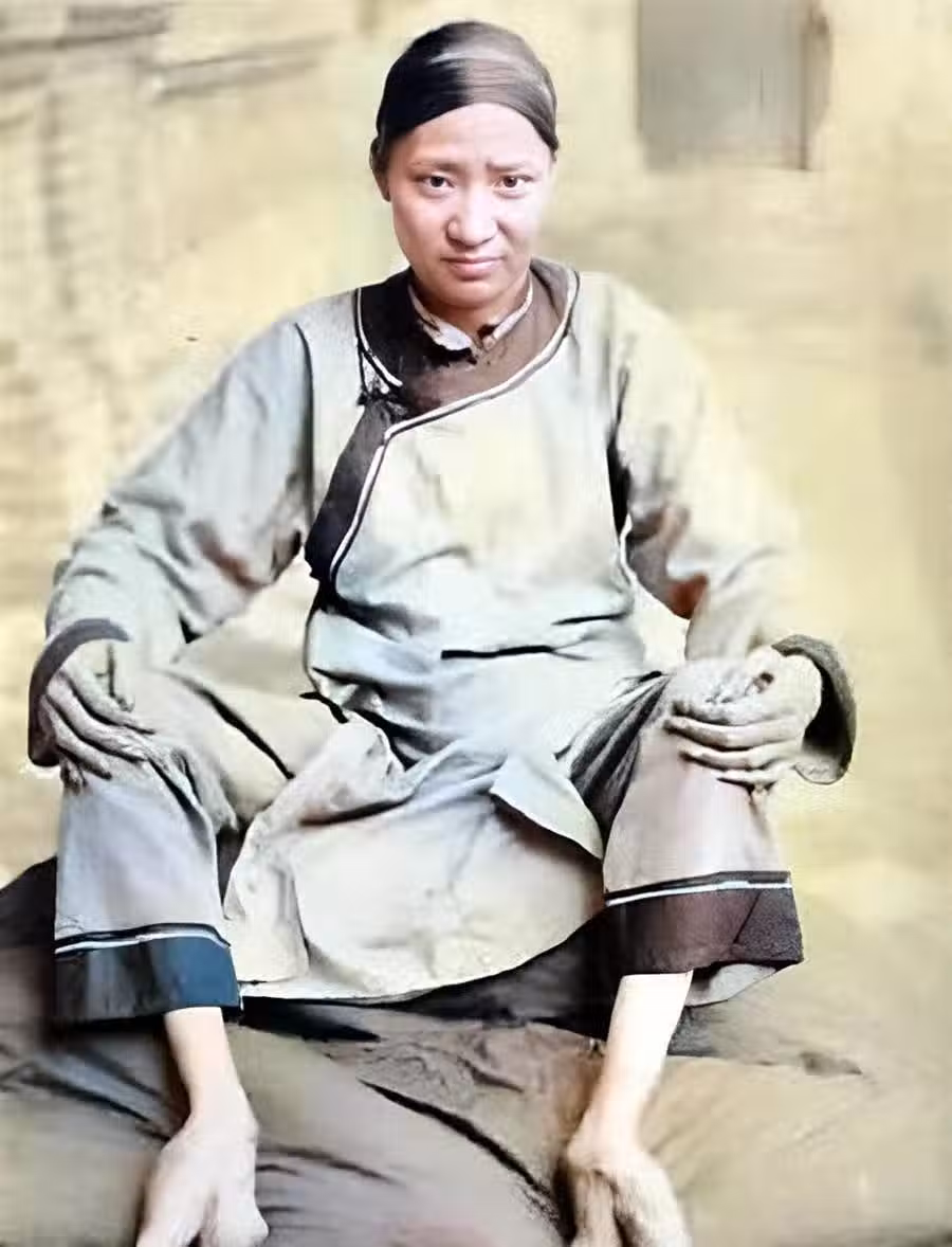 清朝末期,有一位女子出現在鏡頭前展示她裹著的小腳。小腳一雙,眼淚一缸。看到這張相片,從小拿布條硬裹住腳弓,窩成倒U型,走路的左右掂著走,從小到老腳一直都在痛!不管怎麼說,我都不能夠表達內心的這種悲戚,可憐的女子啊,這樣的小腳走不穩吶,不能支撐整個身體呀,裹足不前吶