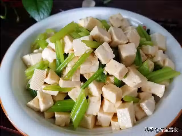 【芹菜拌豆腐】所需材料:北豆腐1塊、芹菜250克、香油1湯匙、姜1片、鹽適量、