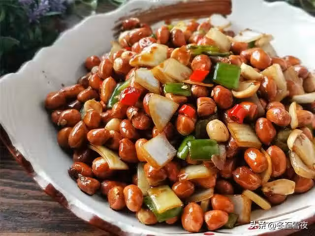 【老醋花生】所需材料:花生米半斤、洋蔥半個、尖椒1個、小米辣2-3個、油鹽適量、老陳醋8湯匙、海鮮醬油2湯匙、白糖5湯匙、