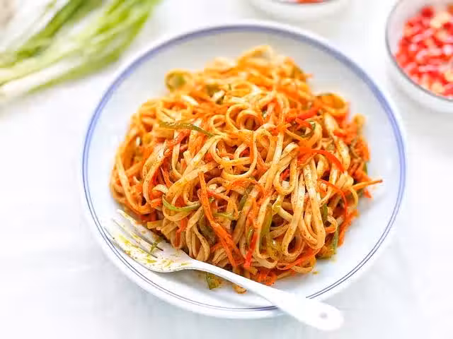 所需食材:麵條2人份、青辣椒2個、胡蘿蔔半根、辣椒粉2勺、孜然粉適量、花椒粉適量、小米辣6個、生抽2勺、鹽適量、黑胡椒粉適量、大蒜2瓣