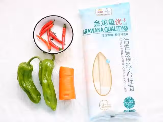 2、接著將洗乾淨的胡蘿蔔、青辣椒和小米辣都切成絲狀待用。不太能吃辣的,可以把小米辣換成普通的紅菜椒。