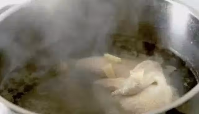 4、第三次之後,將整隻雞放進鍋中,水一定要沒過整隻雞,改為小火;水沸騰後,加少量冷水,再沸騰再加,讓水處在即將沸騰的臨界點,5分鐘左右,將雞撈出翻面,繼續重複上述操作,5分鐘左右關火,蓋上鍋蓋燜上大約30分鐘;