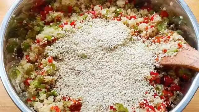4.攪拌均勻後,再放入50g白砂糖,花生米裝入保鮮袋,壓成花生碎後,也倒入盆里。再加入2勺蚝油提鮮,繼續用鏟子攪拌均勻就可以了。