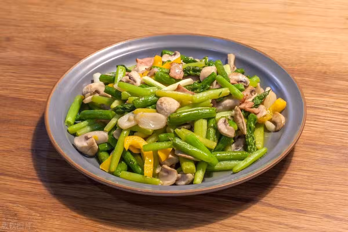 起鍋燒油,加些蒜炒香,放入蘆筍、蘑菇和黃辣椒絲翻炒片刻。