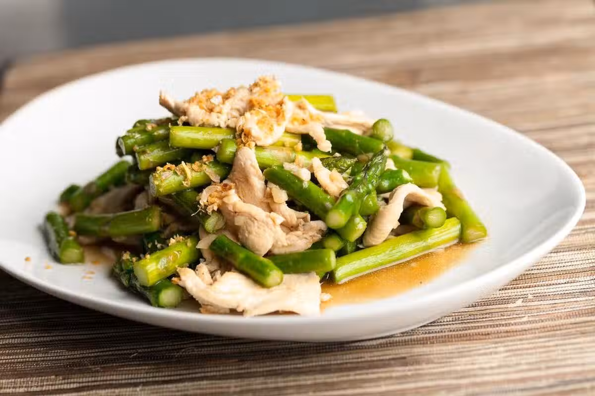 雞胸肉炒熟之後,放入蘆筍,加些鹽和醬油調味,翻炒均勻就可以出鍋了。