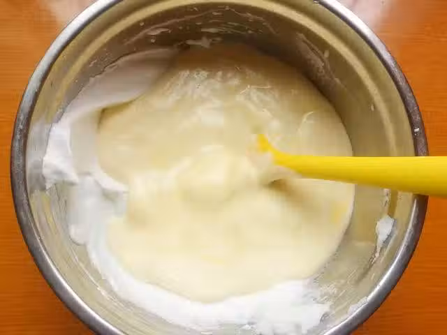 12、將混合好的蛋糕糊倒入烤盤內,然後再用刮刀將表面大致抹平整