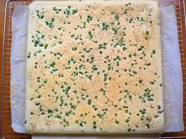 16、晾涼到手溫後,將表面蓋上一張油紙,然後給它翻個面,將蛋糕胚底部油紙撕開