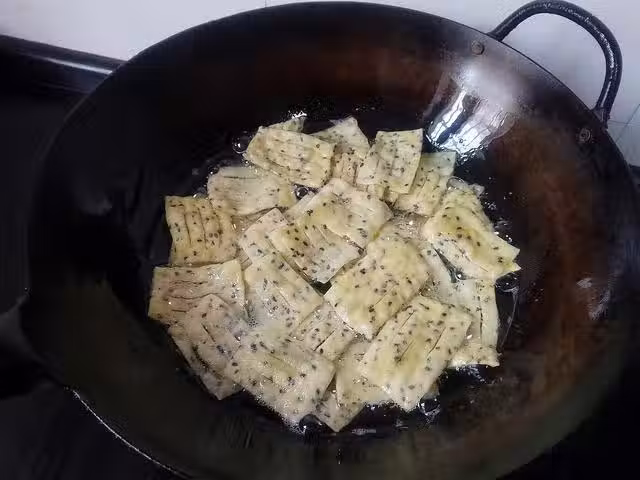 1、不會看油溫的朋友教大家一個簡單的方法,準備一片面片的邊角料,丟進油鍋內,等它浮起後,就代表油溫可以了