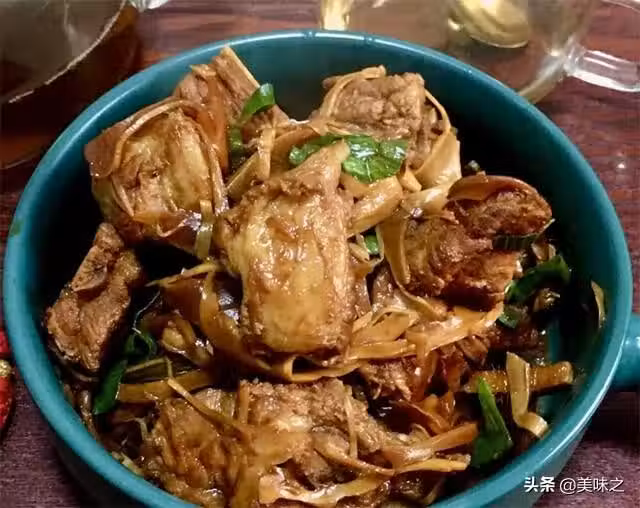 排骨500克、筍乾250克、蔥適量、清水若干、蔥花小許、姜適量、滷肉料小許、冰糖20克、食鹽2克、生抽10克、老抽20克、雞精2克。