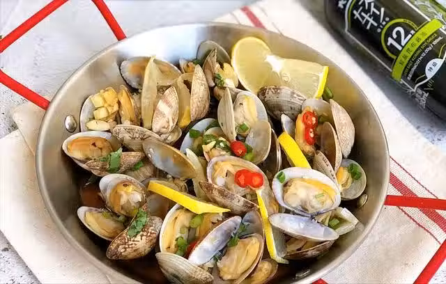 4、接下來往花蛤中加入薑絲、蒜泥、生抽、香醋、香油、檸檬等,攪拌充分混合入味即可。這樣一道涼拌花蛤就做好了,酸辣開胃又營養好吃。