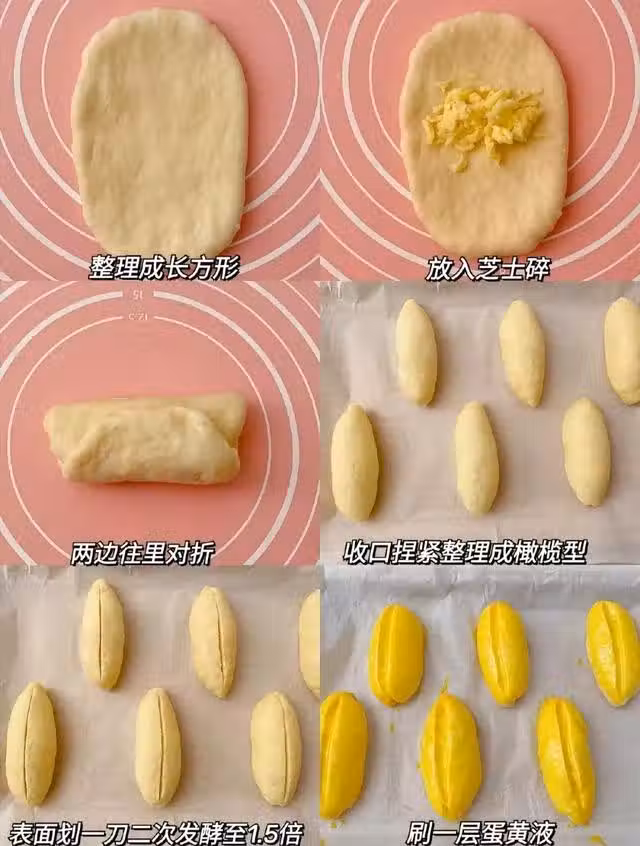 2、揉好的麵糰,蓋上保鮮膜放到溫暖的地方發酵至兩倍大,然後取出排氣,分成6個均勻的小劑子。小麵糰整理成長方形,放入芝士對摺包起來,收口捏緊整理成橄欖型,表面劃一刀,二次發酵至1.5倍大。