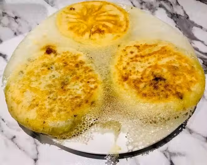 把餡料包好,壓扁。不粘鍋冷鍋放油,晃勻,餅放入鍋中,放置5分鐘。(二次醒發)開火,剪黃後翻面,加入稀面水,蓋好蓋子,燜干。