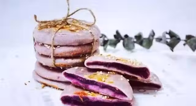 6. 粘少許白芝麻,鍋內加入少量油,放入紫薯餅,微微變色翻面煎,直到兩面都煎熟,餅鼓起來即可。