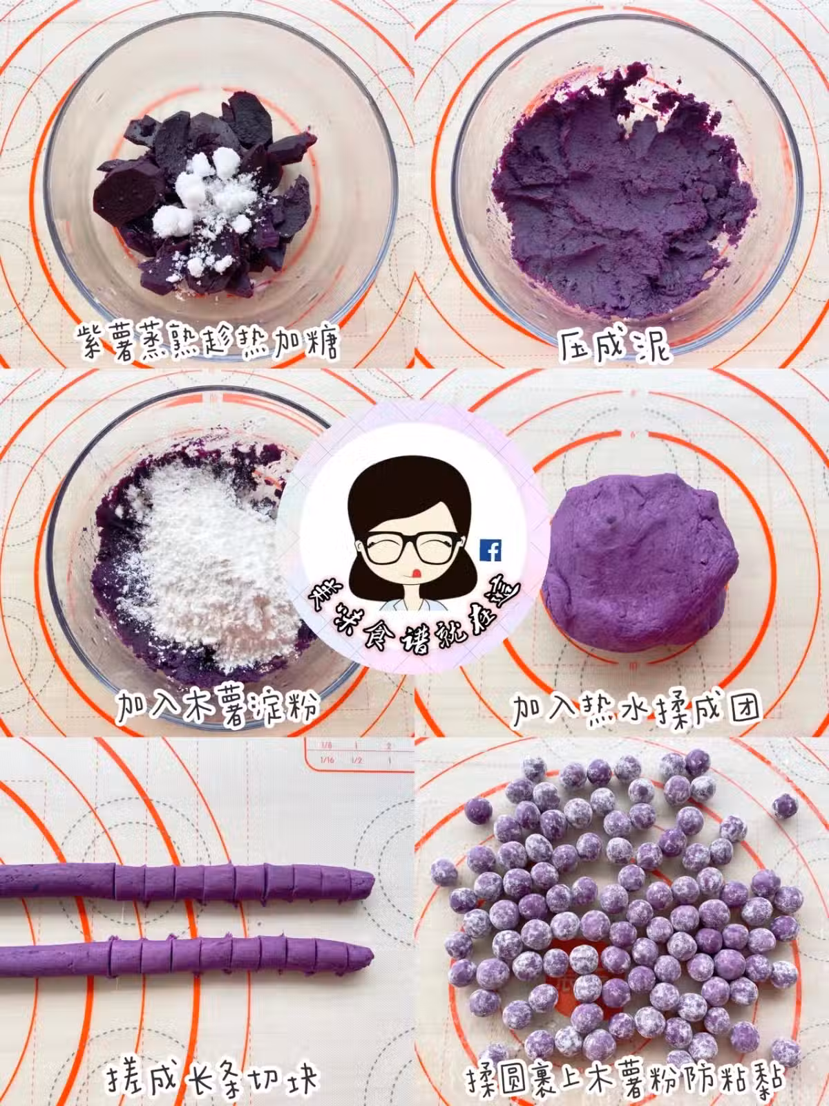 紅薯芋圓:紅薯 150克 木薯澱粉 80克 開水 30克 糖 20克