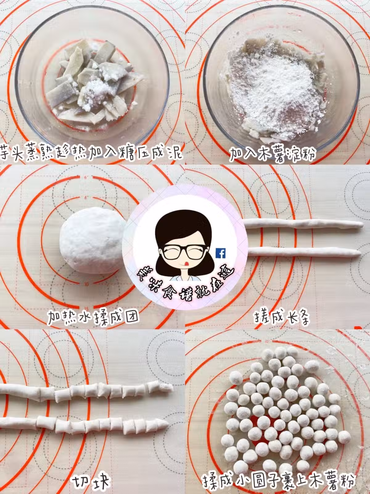 抹茶芋圓:芋頭 150克 木薯澱粉 80克 開水 50克 糖 20克 抹茶粉 3克