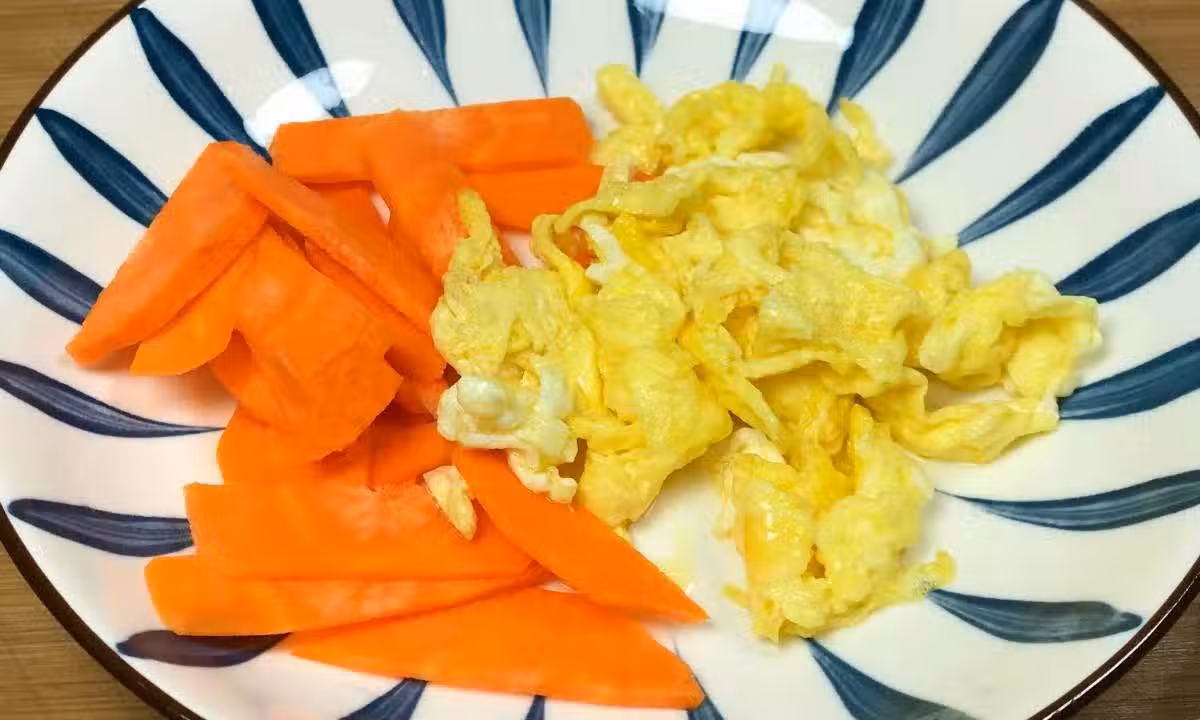 【芹菜炒雞蛋】 所準備的食材有:芹菜、雞蛋、胡蘿卜、大蔥、姜、味極鮮、雞精、香油、食用油、鹽、胡椒粉