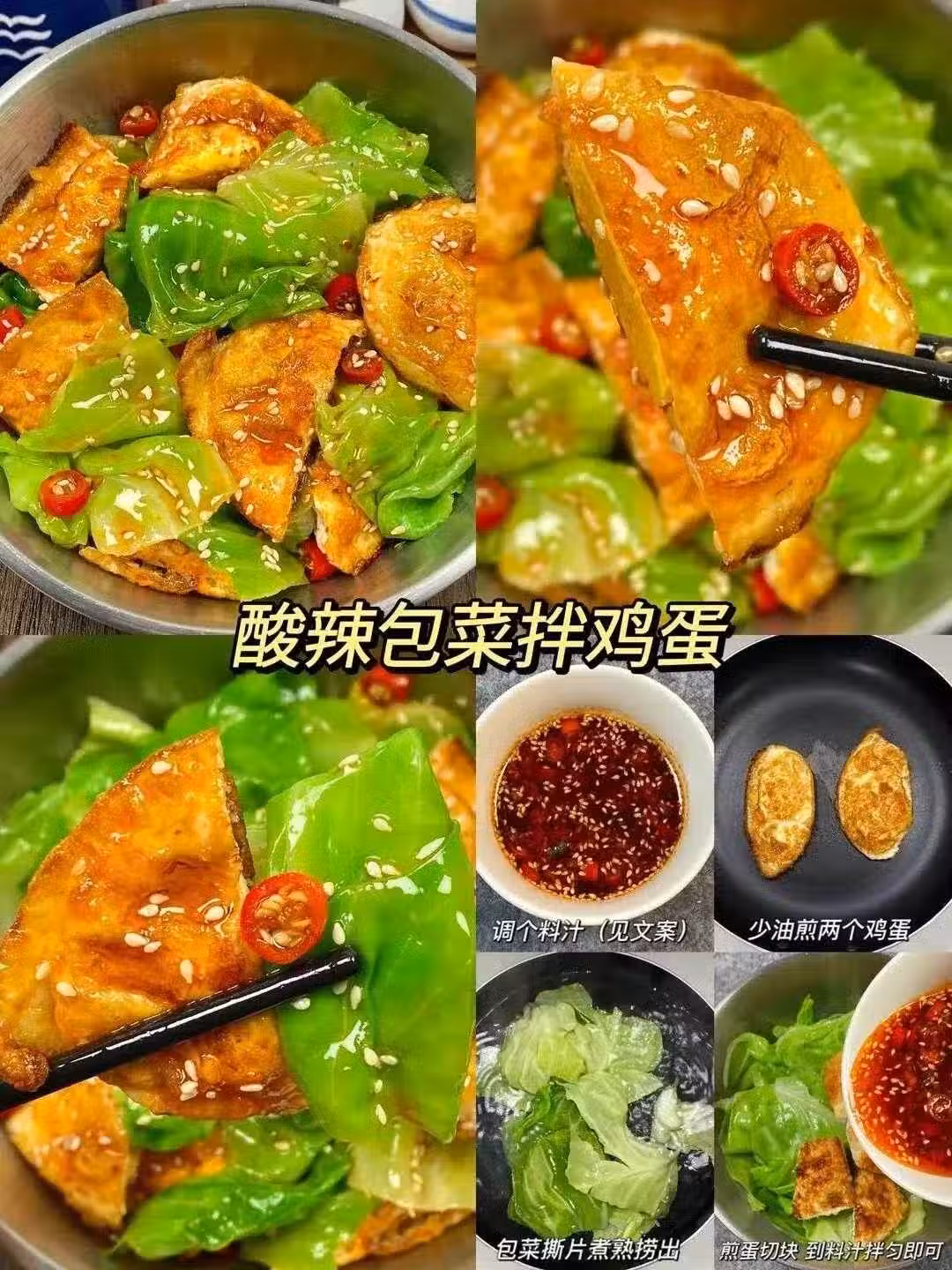 - 煎熟的雞蛋切成一小塊,放入剛才調好的酸辣醬汁中,攪拌均勻,讓雞蛋均勻的裹上醬汁。
