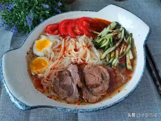 【東北家常冷麵】所需材料:朝鮮冷麵1袋、黃瓜半根、熟雞蛋1個、滷牛肉1塊、西紅柿1個、冰鎮礦泉水1瓶、