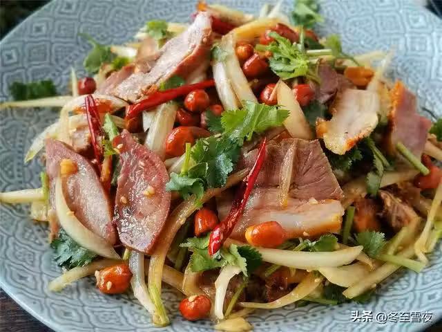 【洋蔥拌豬頭肉】所需材料:豬頭肉(熟)半斤、洋蔥半個、 花生米1小碗、香菜2棵、油鹽適量、香油半湯匙、大蒜2瓣、干辣椒5-6個、芝麻半湯匙、海鮮醬油2湯匙、米醋1湯匙、白糖半湯匙、