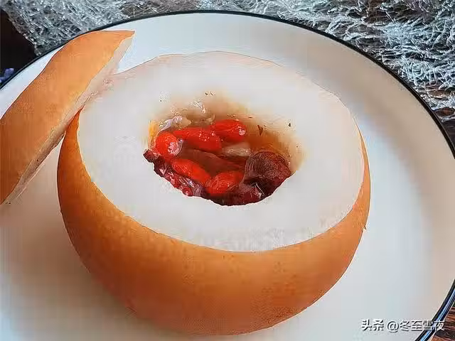 【冰糖雪梨盅】所需材料:梨1個、白冰糖或者黃冰糖4-5粒、大棗2個、枸杞7-8粒、
