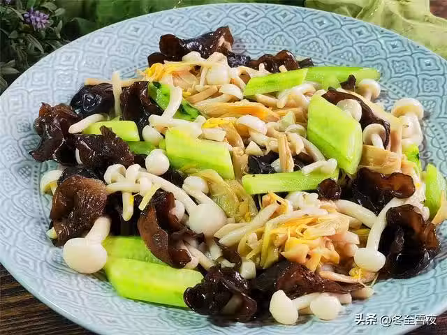 9.下入木耳、黃花菜、白玉菇一起大火翻炒,加入鹽,雞精,翻炒均勻,淋入適量的水澱粉勾薄芡,大火翻炒幾下,關火,盛出裝盤即可,一道清淡可口的森林小炒就做好了。