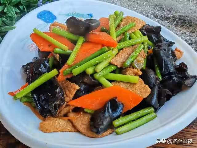 【蒜薹炒木耳】所需材料:蒜薹200克、木耳1把、胡蘿蔔1段、豬肉150克、油鹽適量、蔥1段、姜2片、蚝油1湯匙、生抽1湯匙、料酒半湯匙、